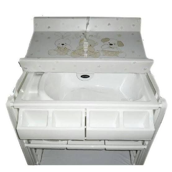 . Matras bagian atas untuk ganti popok dilenkapi dengan seat belt . Bagian tengah bawah matras ada bak mandi . Paling bawah di lengkapi dengan rak untuk menyimpan peralatan mandi baby .